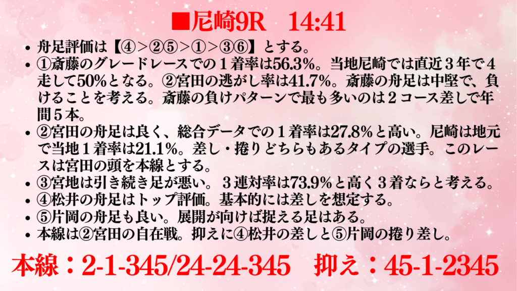 おはようございます。ミナトです。今回は尼崎四日目9Rを予想します!