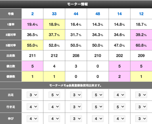 会員登録すると、モーター評価値やメモ・選手メモを残せるようになります。