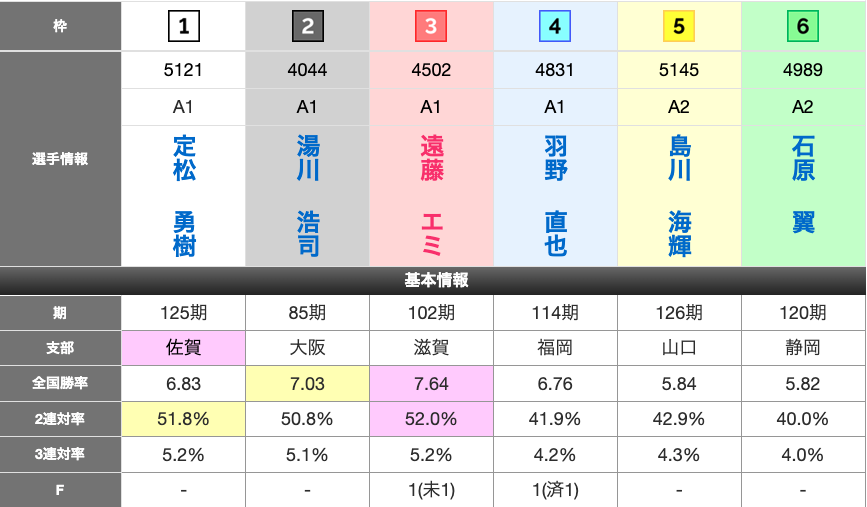 2号艇〜5号艇まで似たり寄ったりな数値が並ぶ。