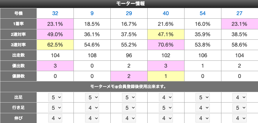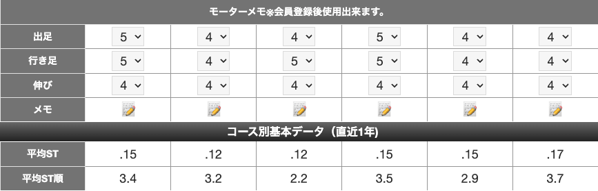 会員登録すると、モーター評価値やメモ・選手メモを残せるようになります。