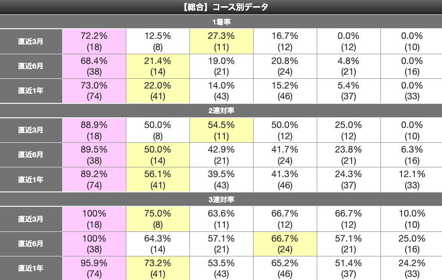 ②湯川のコース実績も優秀だ。全項目で色がついていて安定感が見て取れる。