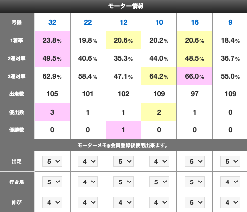 会員登録すると、モーター評価値やメモ・選手メモを残せるようになります。