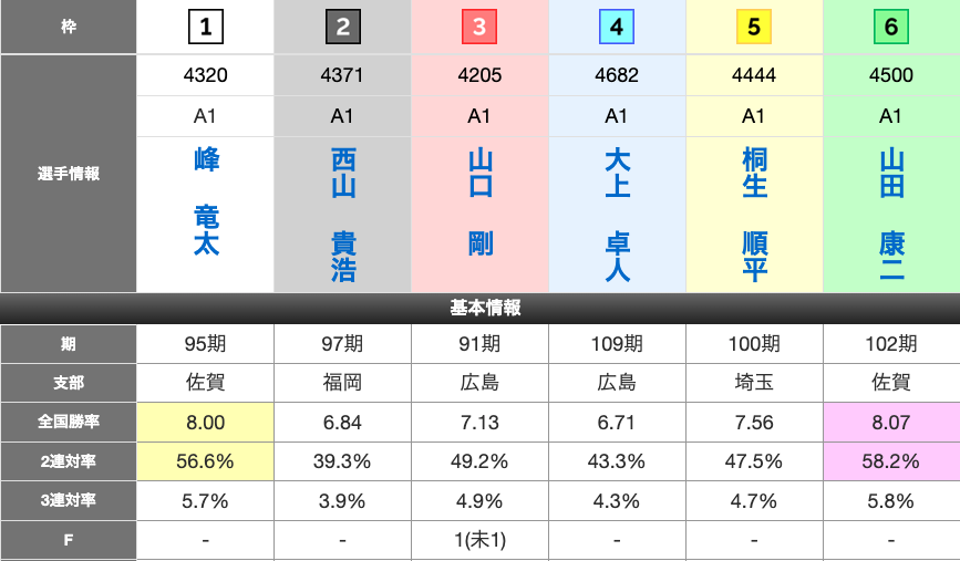 6号艇山田は、1着率こそ目立つが、このレースは逃げに絞って考えるのでそこは無視する。