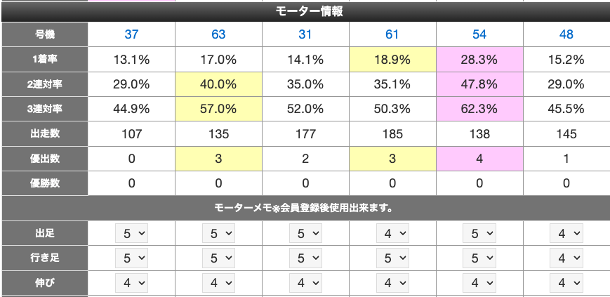 会員登録すると、モーター評価値やメモ・選手メモを残せるようになります。