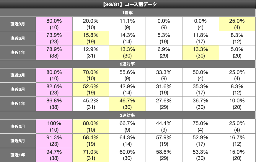 1号艇峰の1着率はグレードレース直近1年データで78.9%。