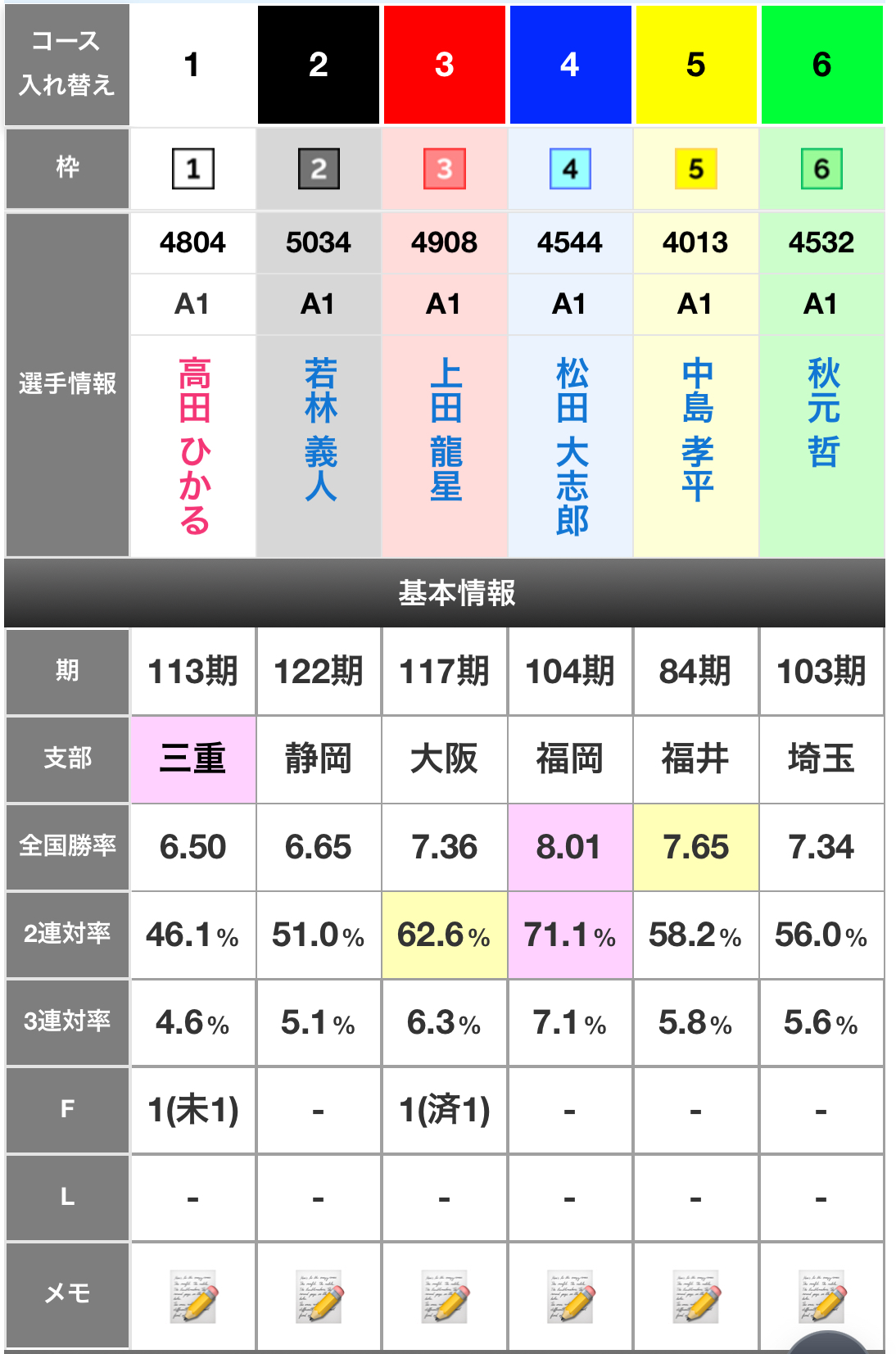 ④松田選手が捲りに攻めた時⑥秋元選手の連対率が高い。またモーター機力も良さそうでここを軸にします。