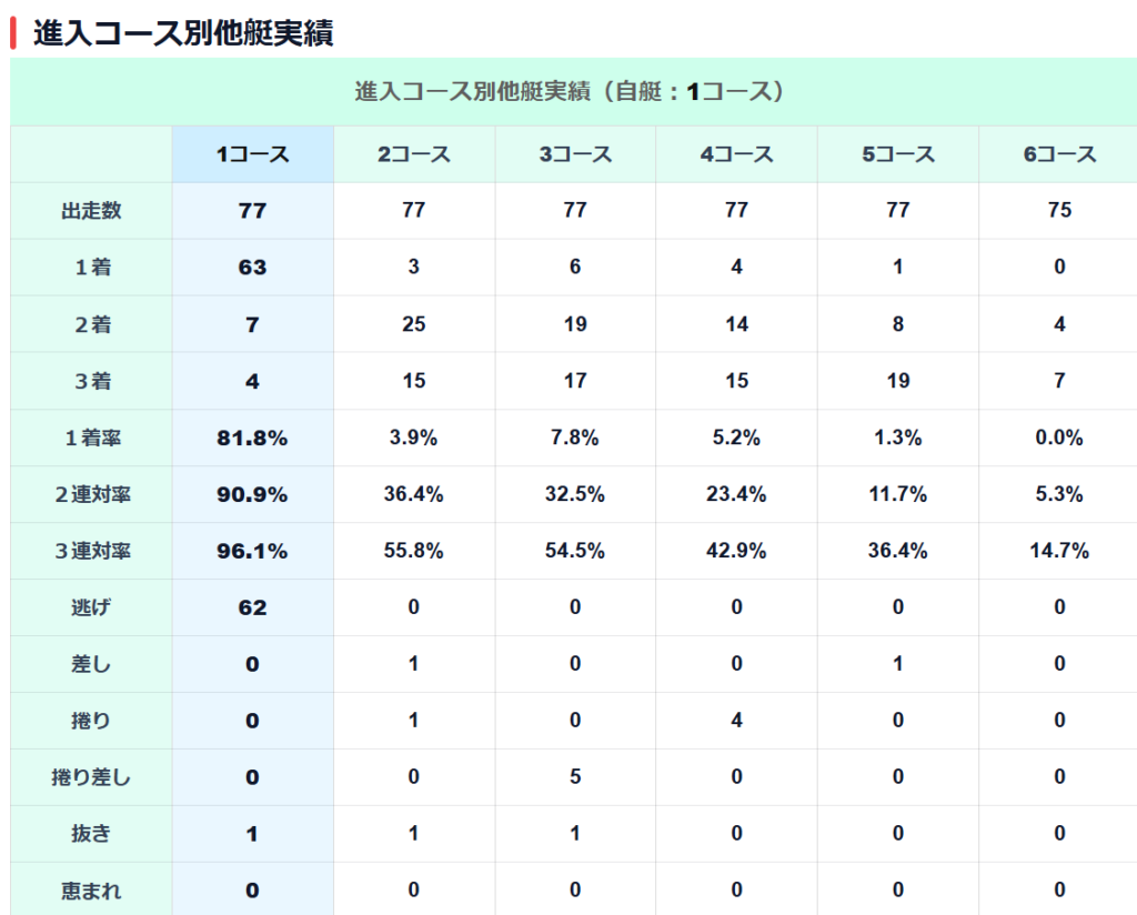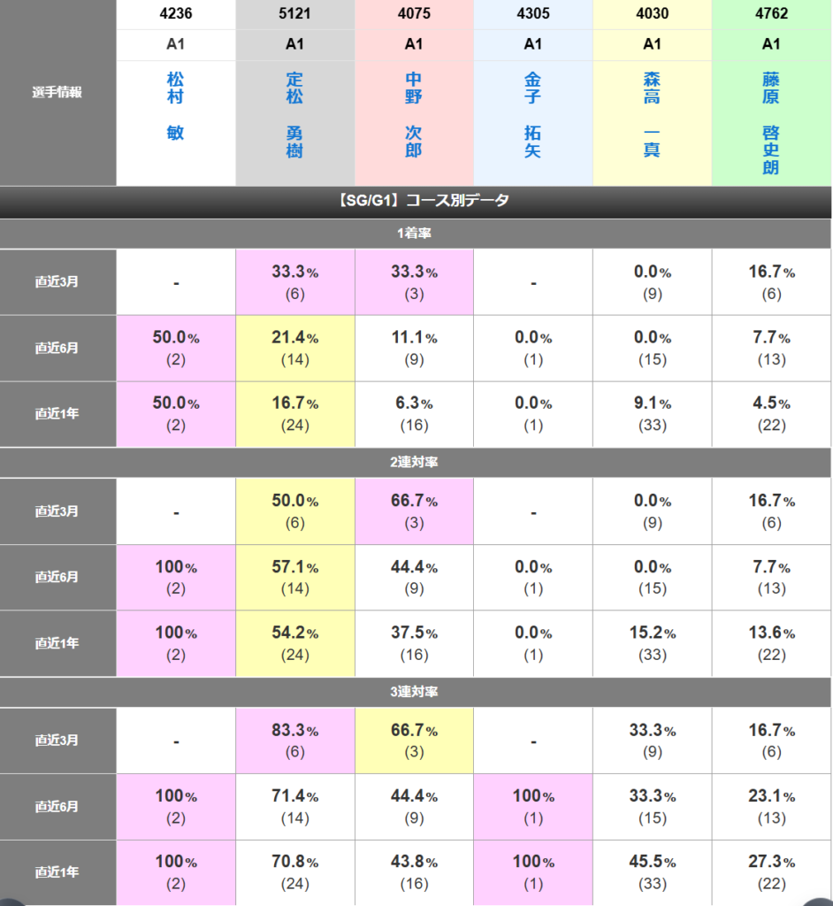 ①松村選手のイン戦。勝率81%。SG・G1においては参考データは少ないが、スタート巧者でコース別平均.11(2.0)とこのメンバーの中でも最上位。