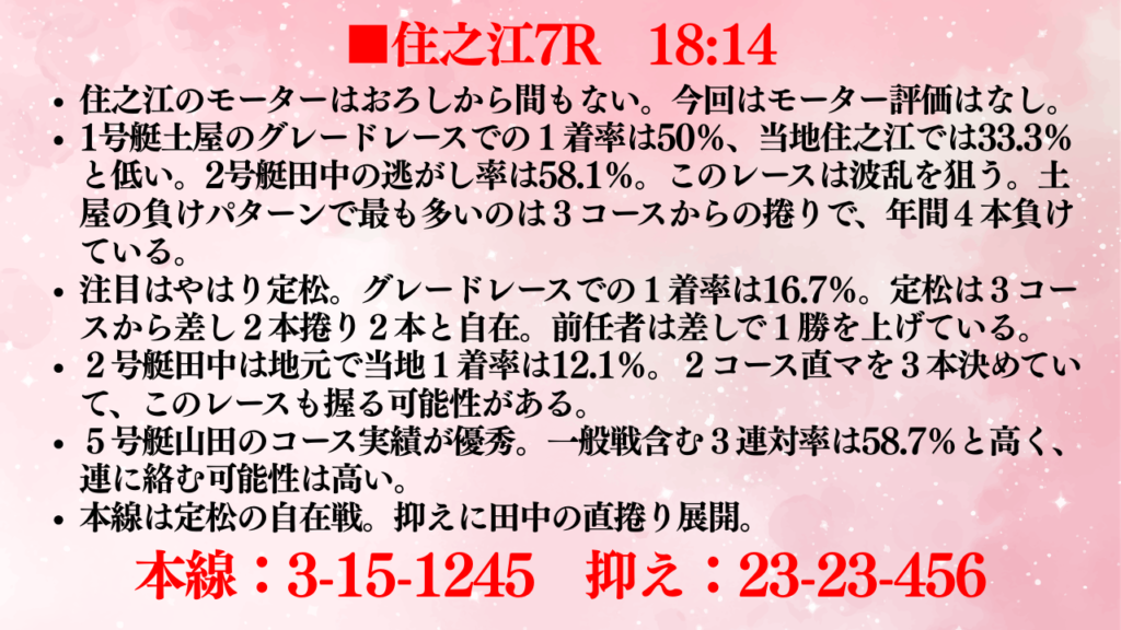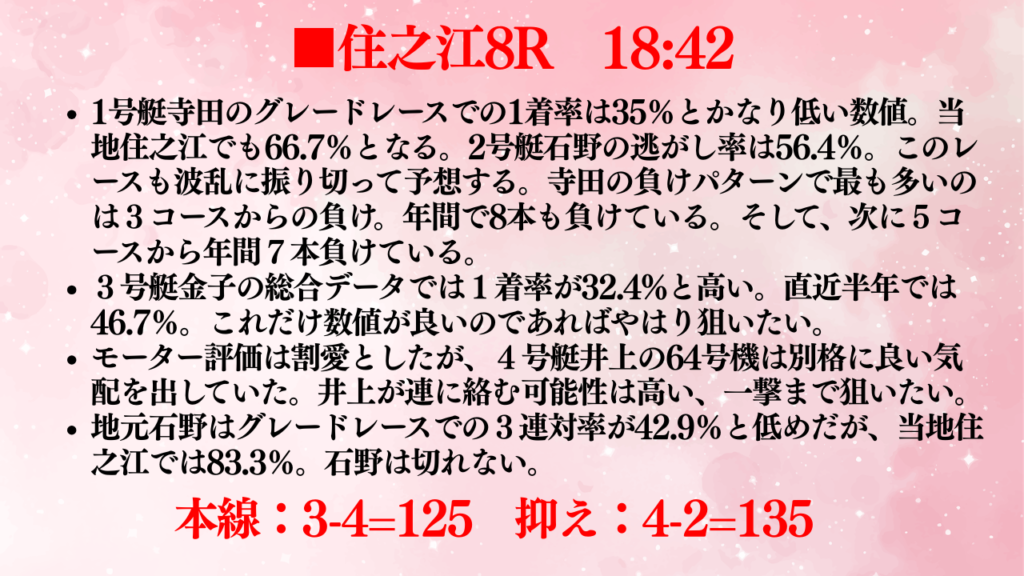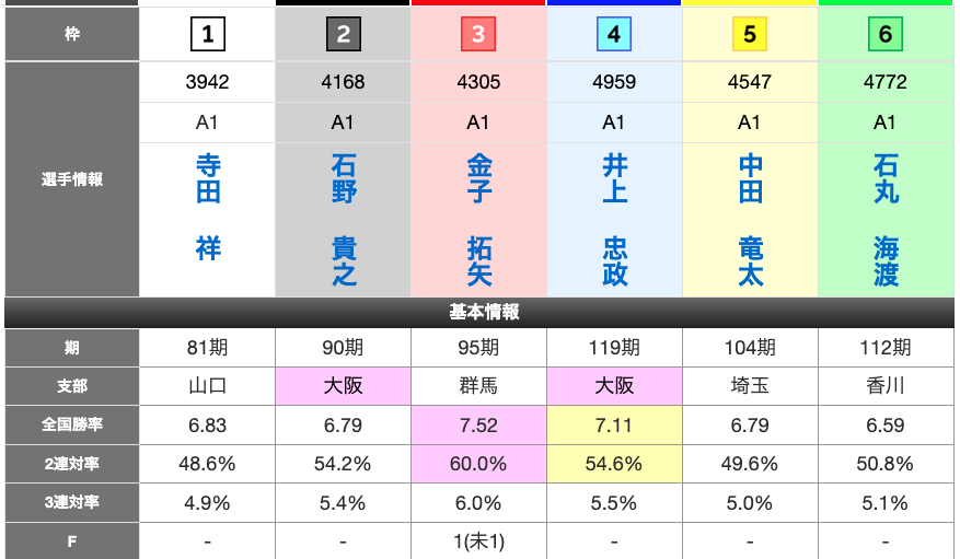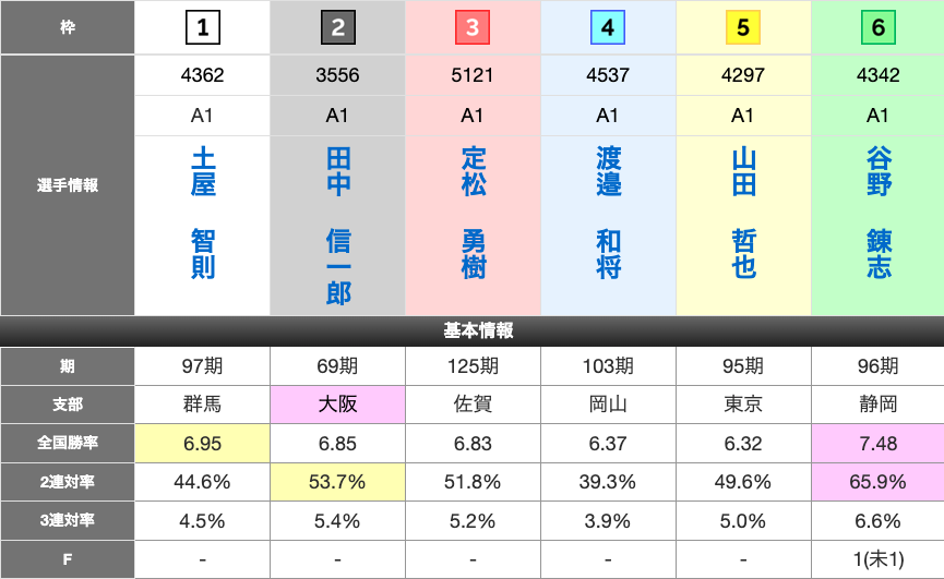 やはり金子の数値は良いものがあるし、寺田の負けパターンにも合致する。STに不安はあるものの、金子の捲り差しを本線にする。