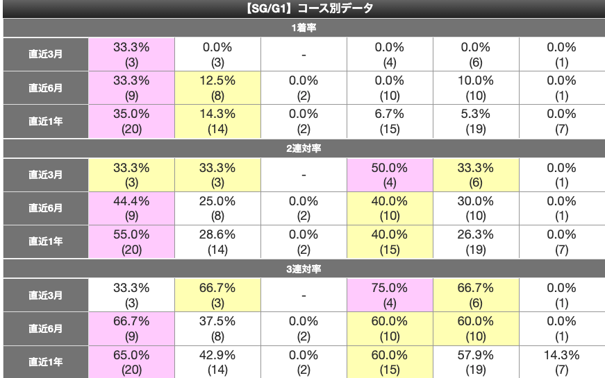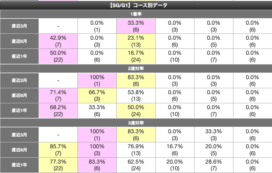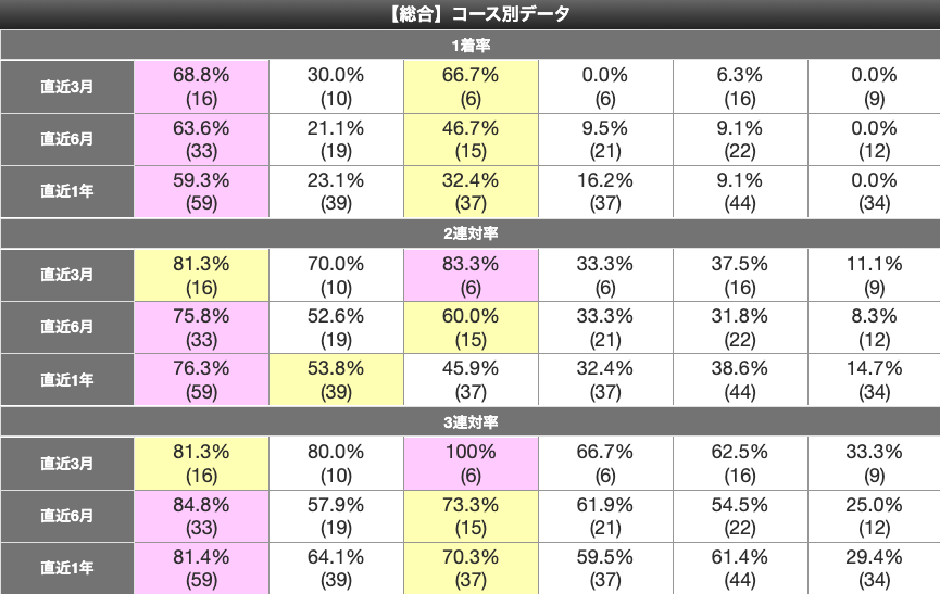 5号艇山田のコース実績は優秀で、4号艇渡邉よりも高い数値をマークしている。
