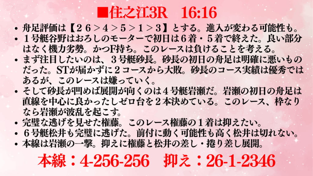 また、岩瀬の1着があるとすればこのパターンが濃厚とも考えている。