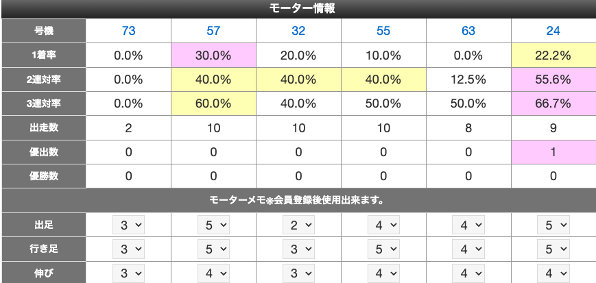 会員登録すると、モーター評価値やメモ・選手メモを残せるようになります。