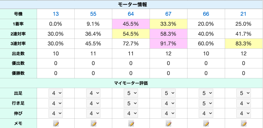 会員登録すると、モーター評価値やメモ・選手メモを残せるようになります。