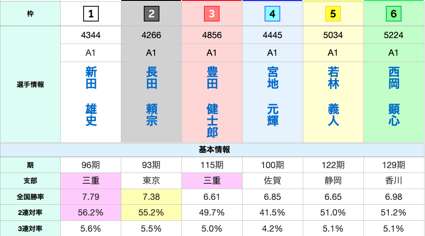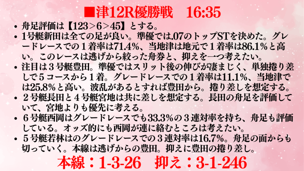 地元津の水面では直近3年間で差し1、捲り1,捲り差し2と決めており、このレースも捲り差しを想定する。