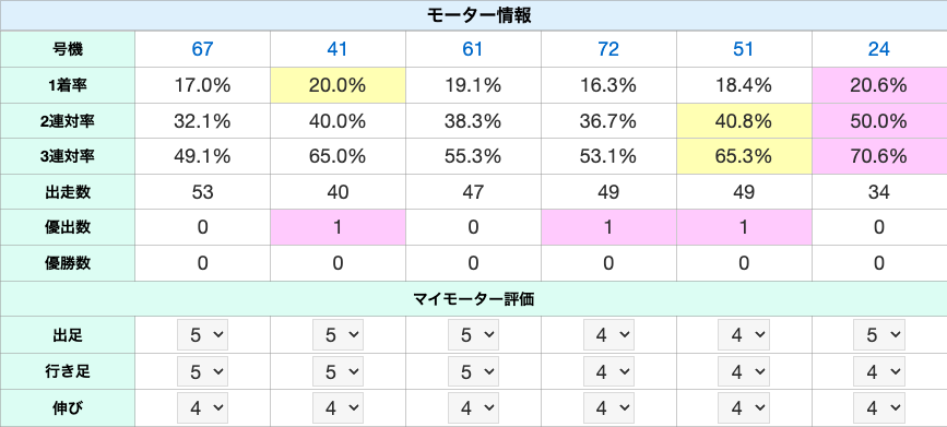 会員登録すると、モーター評価値やメモ・選手メモを残せるようになります。