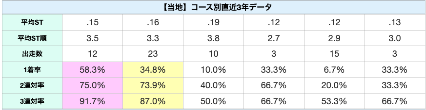 当地児島での1着率は58.3%となり、やはり弱めだ。