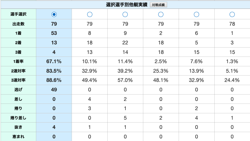 仲口は3コース捲り差しで最も多く負けているが、2コース差しもそこそこに食らっている。