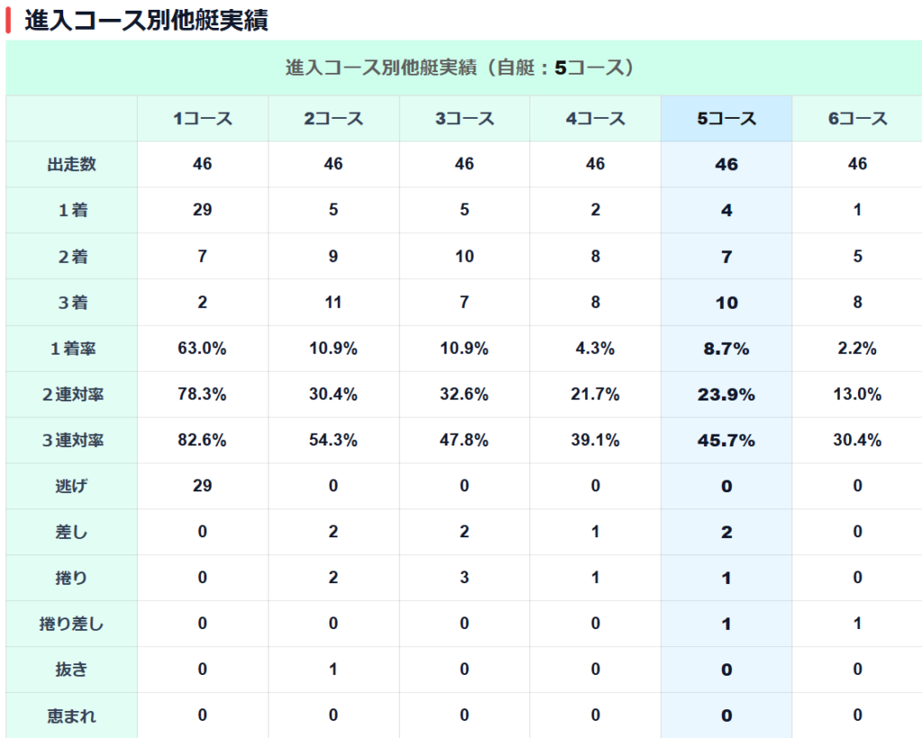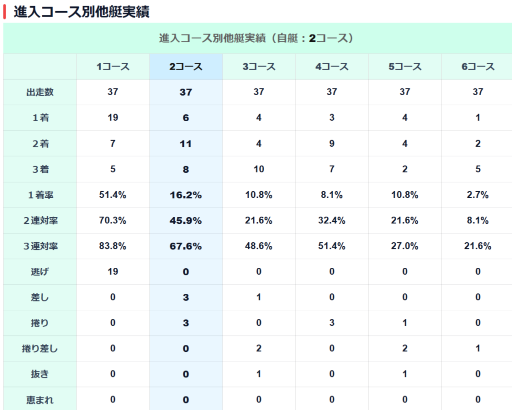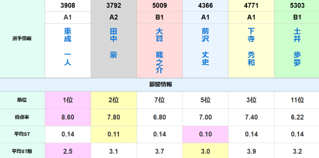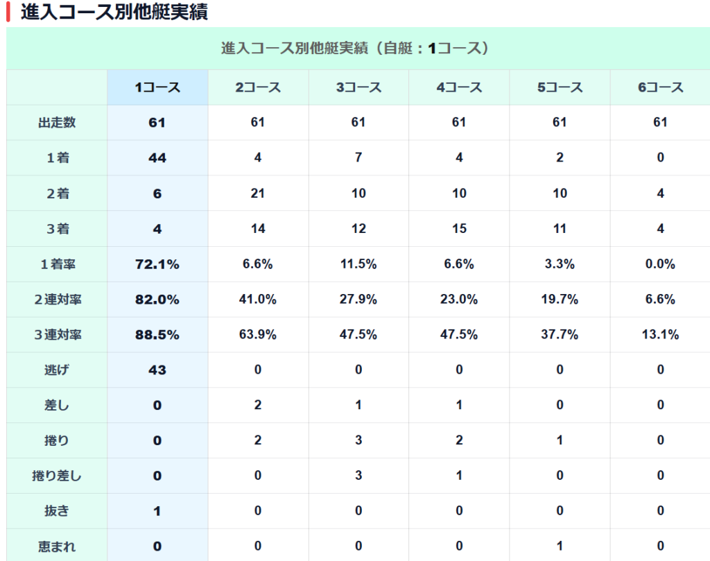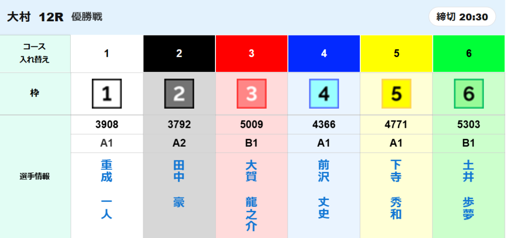 ①重成選手の逃げ率72%。3コースから捲り3本・捲り差し3本の被弾があり、3コースからの負けが一番多い選手。舟足は最上位で、先マイ出来れば逃げることは出来る。
