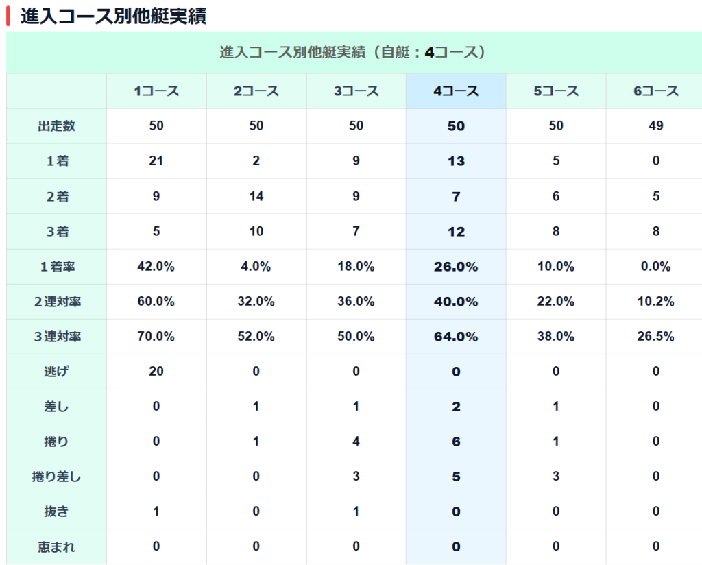 4コース勝率26%。差し2本・捲り6本・捲り差し5本と自在に仕掛けられる選手。ただし、舟足は最下位評価をしており、捲り切る舟足はないと見る。