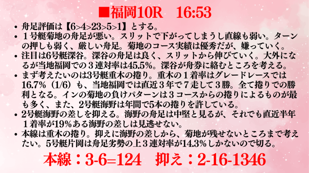 そしていずれの場合にも6号艇深谷が連に絡むところは考えたい。