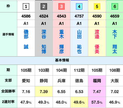 5号艇渡邉のコース実績は良いとは言えないが、当地福岡は地元で3連対率が68.8%と結構な数値を持っている。