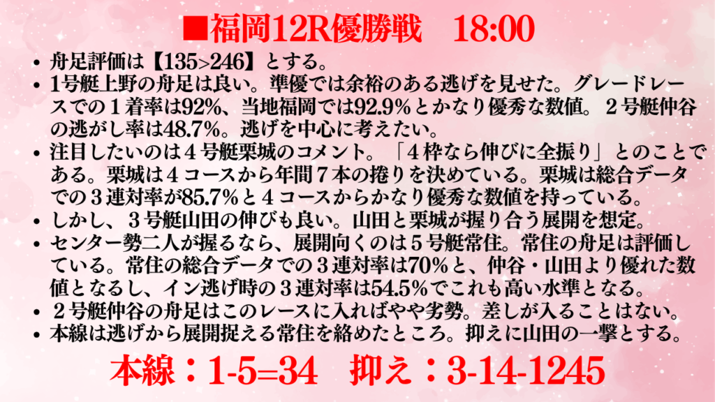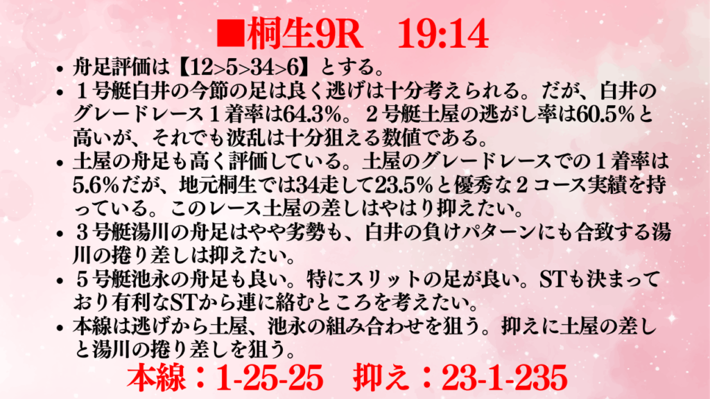 今回は福岡の優勝戦と桐生の準優から9Rを予想しました。