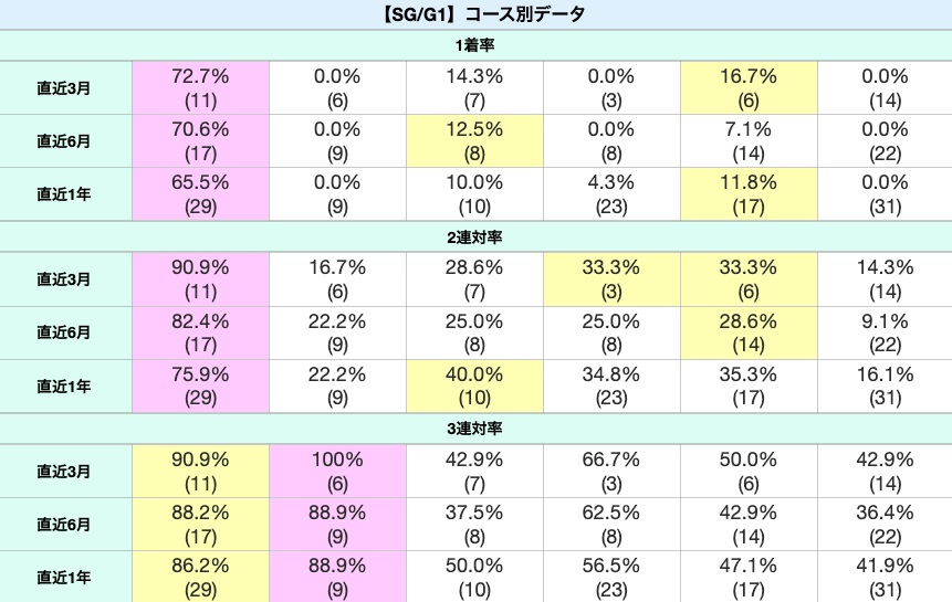 各選手のコース実績。