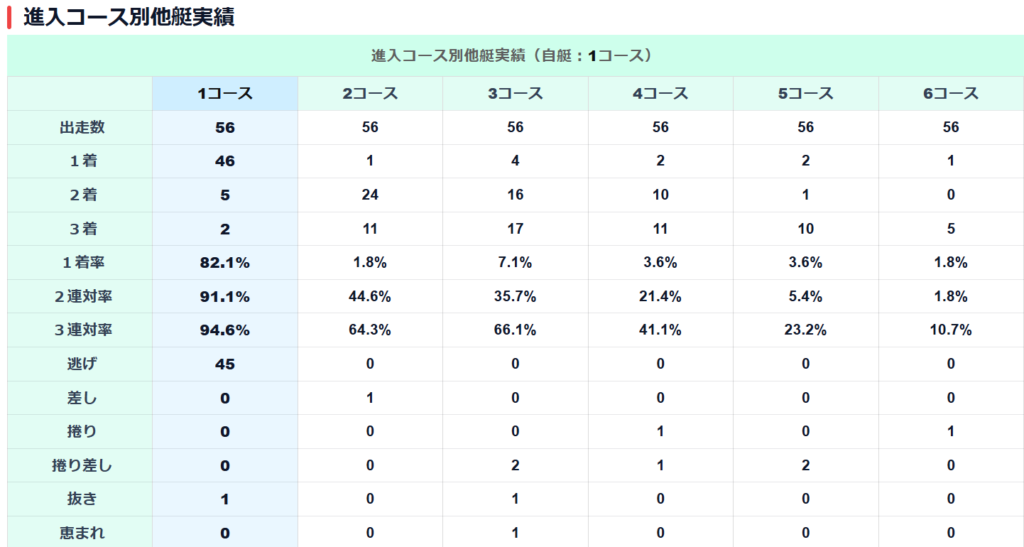 ①原田選手の逃げ率は82%。1コースの3連対率は94%と非常に高い。ほとんどのレースで逃げれている選手ではあるが、一番多いのは3コースからの被弾。捲り差し2本の負けはある。