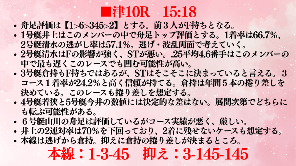 そして2号艇清水、3号艇倉持は優秀な数値を収めている。