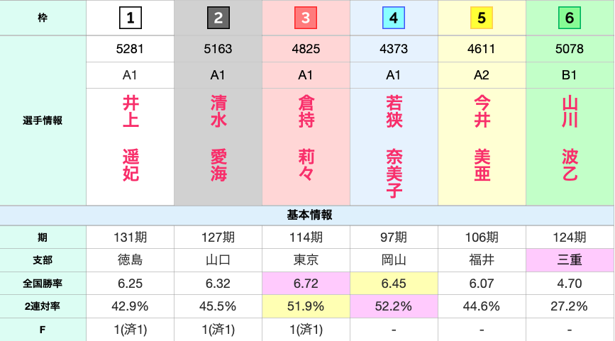 6号艇山川は、舟足を評価しているがコースデータは悪い。
