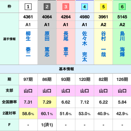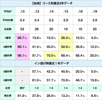 注目したいのは、2号艇原田の3連対率。84.2%と高く、舟券に絡む可能性の高い数値と言える。