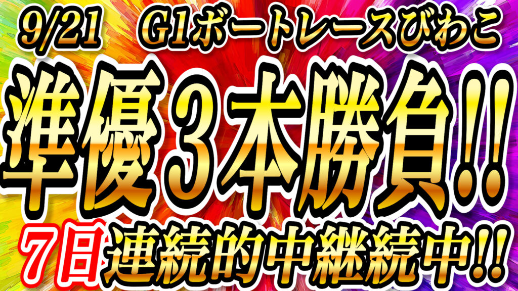 おはようございます。ミナトです。昨日は1本的中。びわこ10R 1-3-2 13.9倍!!これで連続的中記録は七日となりました。今日も当たるでしょう。 【最近の的中】9/14 鳴門7R 2-6-4 23.1倍9/15 鳴門12R 1-4-6 6.2倍9/16 若松9R 1-5-2 19.7倍9/17 ...